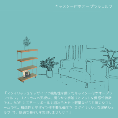 スタイリッシュなデザインと機能性を備えたキャスター付きオープンシェルフ。