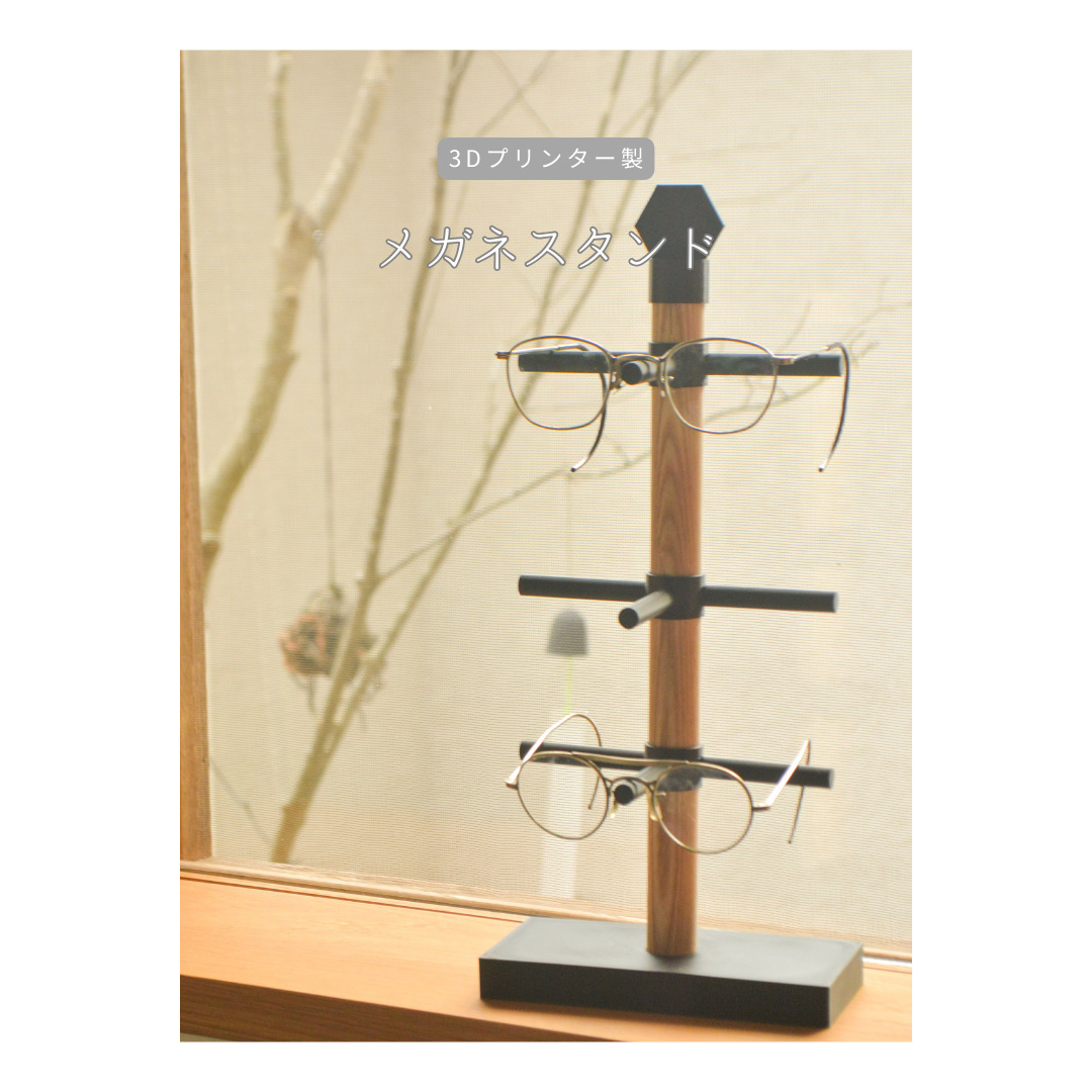 木の温もりと3Dプリンター製パーツのシャープさを組み合わせた、ミニマルデザインのメガネスタンドです。